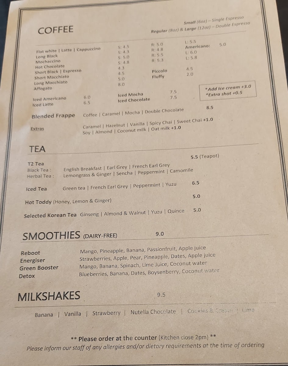 - Tea Selections: T2 Tea including Black Tea, Herbal Tea, Iced Tea, Selected Korean Tea, and Hot Toddy.